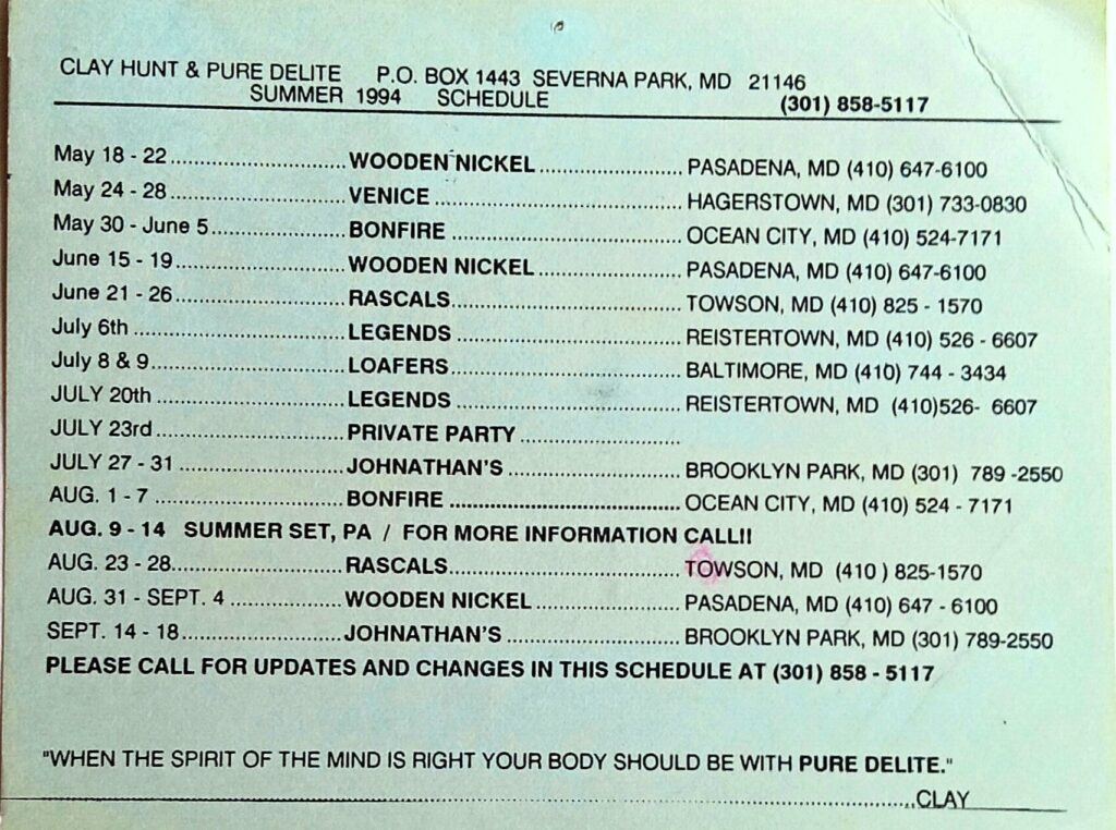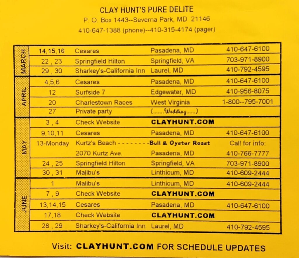 He could be seen in the ‘00s fronting the group Pure Delight at Rascals on Joppa Road, California Inn (Laurel), Cesare’s…