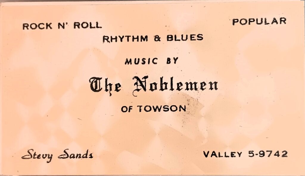 “The Noblemen performed teen centers (Hampton, Rogers Forge, Perry Hall, Villa Cresta…), CYO’s (Immaculate, Sacred Heart…), Church dances (Redeemer, Towson Presbyterian, Towson Methodist…), High schools (Towson Prom, Towsontowne, Towson Catholic, Kenwood…), Swim Clubs (Hampton, Campus Cabana, Stoneleigh, Beaver Dam…), Country clubs (Sparrows Point, Valley, JCC, Har Sinai…), cotillions and private parties… “We appeared on the Kerby Scott TV show and we recorded in a studio on Charles Street two covers – “A Love That Is Real” (Intruders) and “Everlasting Love” (Robert Knight).”