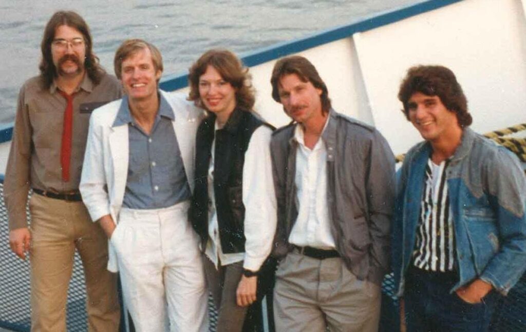 The Marks brothers left in early ’84 as Affinity reverted to their original lineup. Bassist Scott Noyle joined in late ‘84. Erin left to seek fame and fortune in New York in June ‘85. Courtney’s brother Graham filled in on keys on occasion. Mark left in March ‘86. Gary Thacker was lead singer for several months, then Mac Ford (guitar, sax, flute), and Viki Ford (keys, vocals) joined (both ex-Double Jeopardy). Mac had once been in Iguana with Graham Eckler.