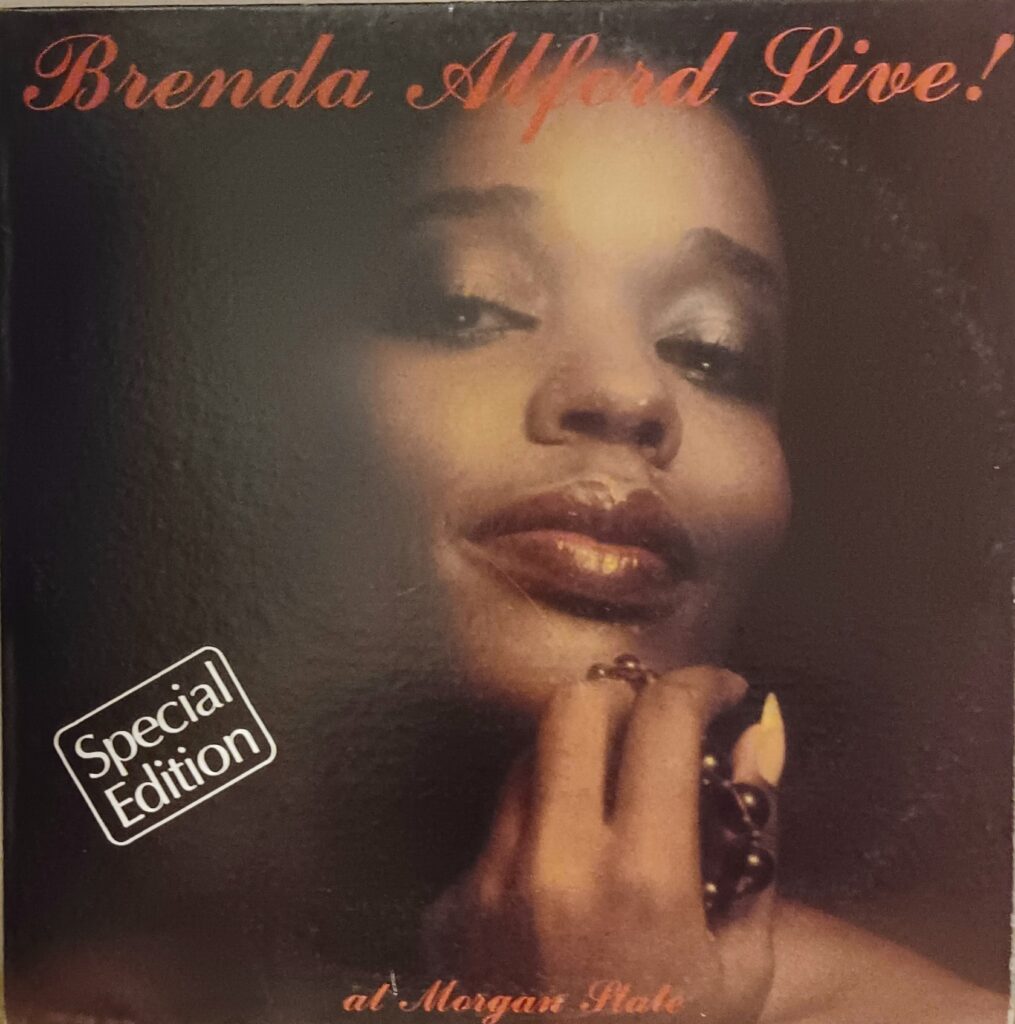 In the ‘80s-90s she was vocalist for the Morgan State University Band and recorded an LP “Brenda Alford Live! At Morgan State.” Backing group for the album featured Gaynell Colburn (congas, percussion), Bob Butta (piano), Terry Plumeri (bass), Kirk Driscoll (drums), Glen Grainger (trumpet), and Benny Russell (sax). Alford also performed a tribute to Billie Holiday at the Eubie Blake Cultural Center. Brenda continued to perform jazz in the ‘00s. Record releases include the CD “My Favorite Things.”