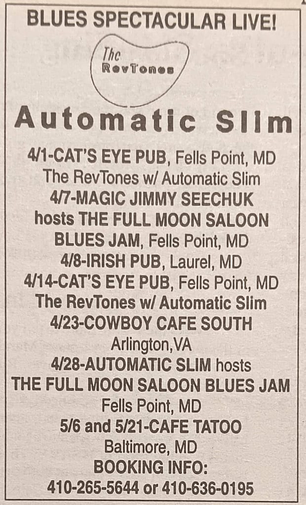 In Baltimore he played solo, a member of The RevTones, The Kelly Bell Band, hosted blues jams at The Full Moon Saloon…