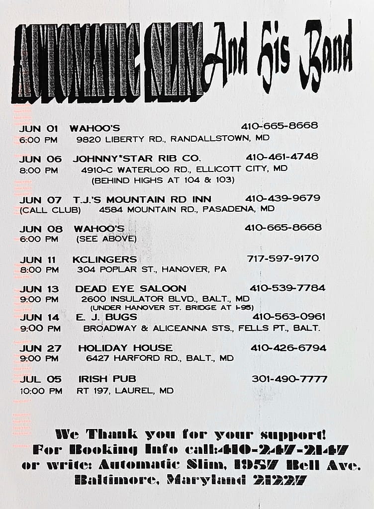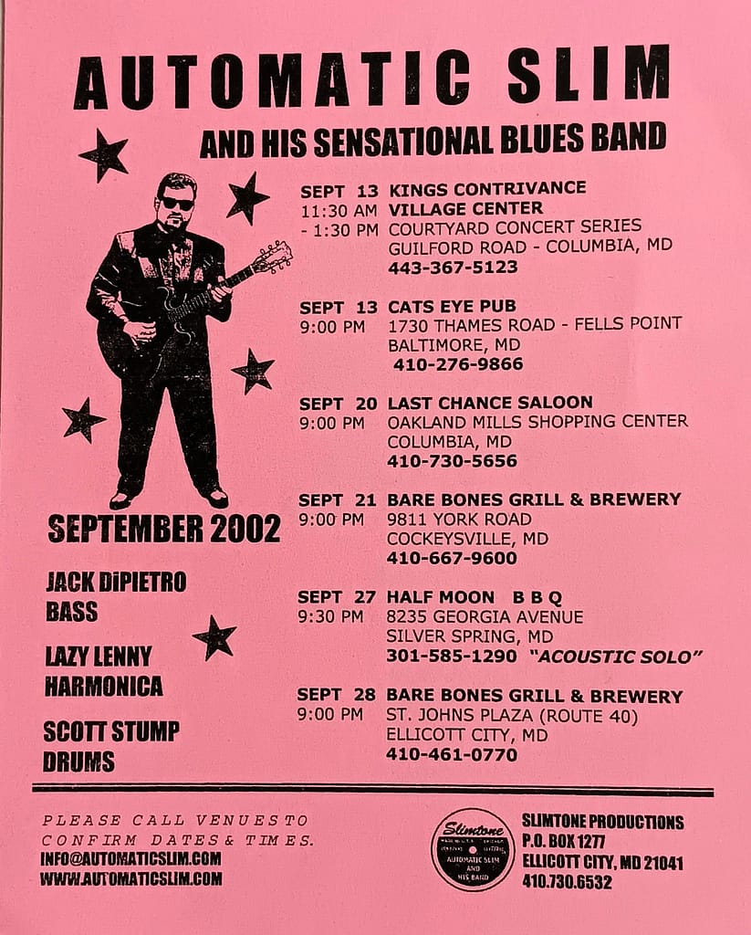 The band performed throughout the Baltimore and mid-Atlantic region. Seen locally at the Cat’s Eye Pub, Bare Bones, Full Moon Saloon, Eight by Ten, Recher Theater, Frisco Grille & Cantina… Concert appearances include the Chesapeake and Baltimore blues festivals, Artscape…