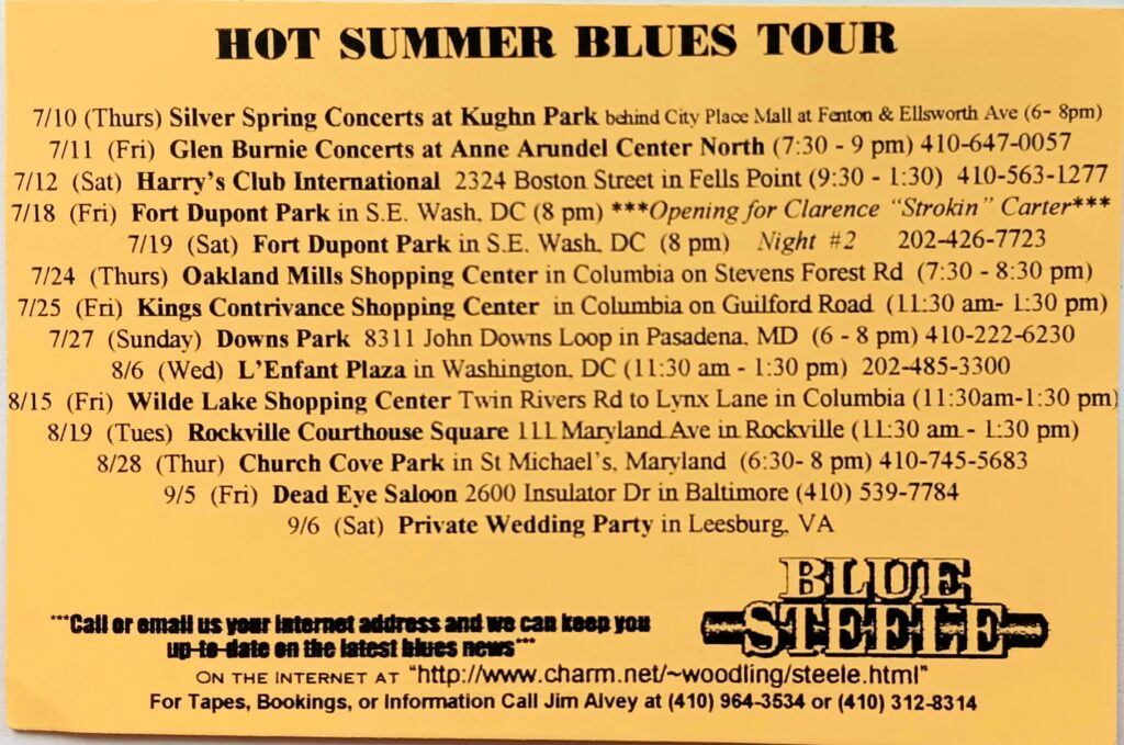Blue Steele performed at Cafe Tattoo, Backstreets, Bentz Street Raw Bar, Michael’s Pub, Fatty’s, Full Moon, L’Enfant Plaza, Hard Rock Cafe… opened for Clarence Carter…