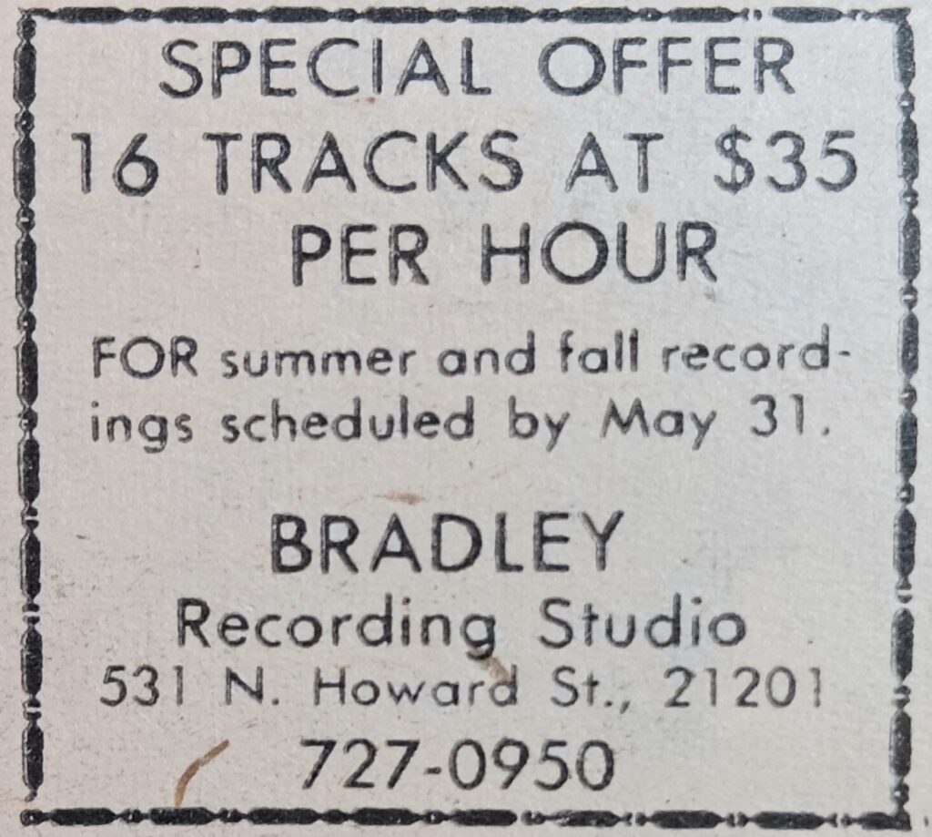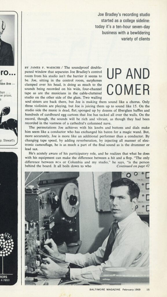Catonsville native Joe Bradley started out at as a hi-fi aficionado at an early age. He broadcasted music from his home on his own pirate radio transmitter. Later, buying an Ampex 960 tape machine he began recording high school concert bands.