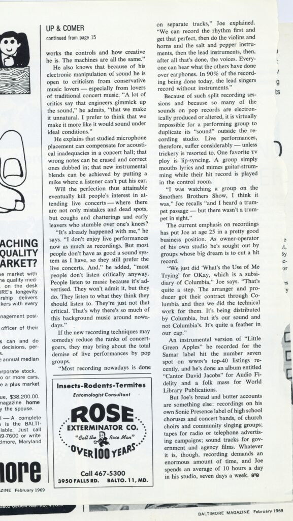 In 1965 recognizing the demand for recording services he obtained a loan and started his own recording studio at 531 North Howard Street. He recorded hundreds of Baltimore area school concerts, glee clubs, rock bands such as the Marauders, Uptowns, Tangiers, Gross National Product, Koffee Beans, Horizon, as well as recordings of folk, gospel, and other styles of music. Joe took his mobile recording equipment to school auditoriums, churches, and anywhere he was contracted to make recordings. He recorded Marvin Gaye live at The Kennedy Center in D.C.