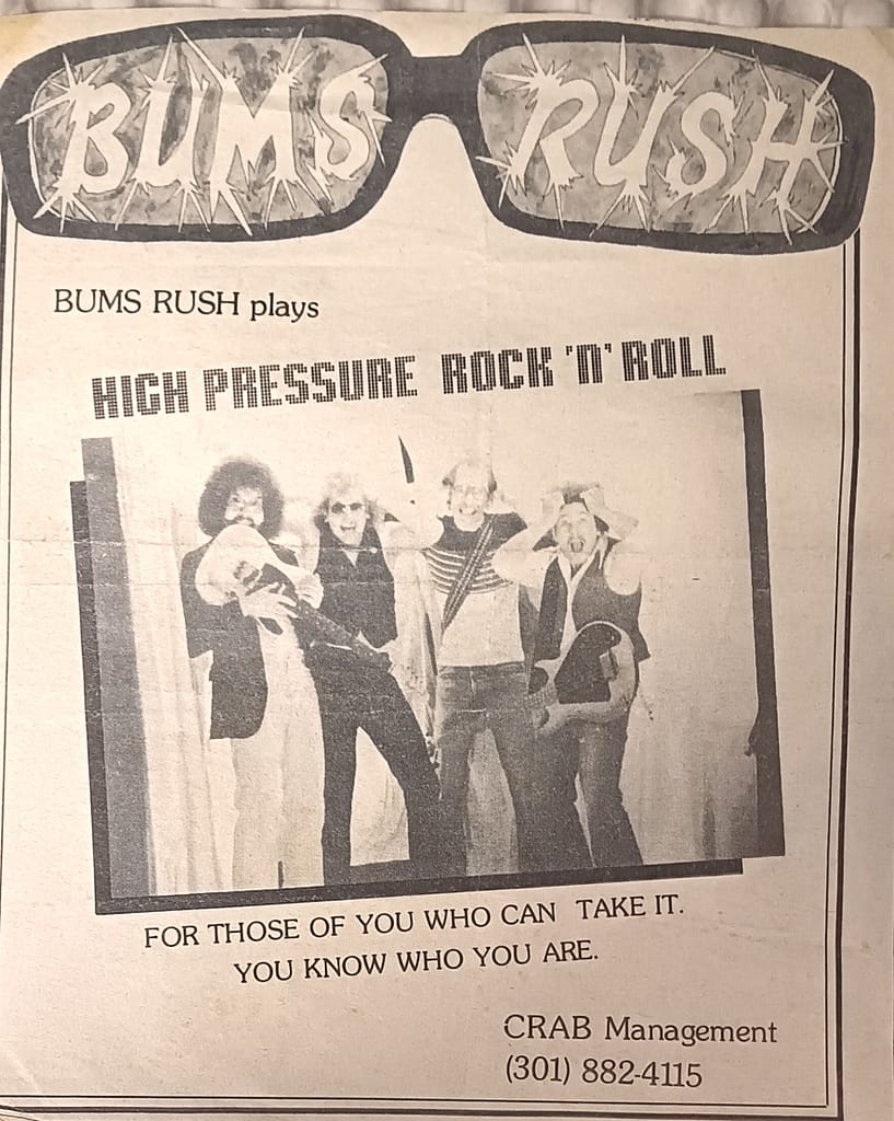 Bum’s Rush performed covers and originals at venues including Seagull Inn, Nelson River Watch, Marble Bar, Eight by Ten, the college circuit including Franklin, Marshall, Towson State, Johns Hopkins… They opened for Nazareth for a New Years Eve concert at Painter’s Mill Music Fair.