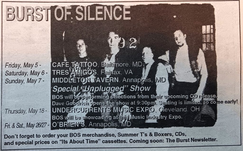 The group became very popular in the Baltimore/DC circuit playing clubs, colleges and festivals. Seen locally at Max’s on Broadway, Bohager’s, Cafe Tattoo, Donnelly’s (Frederick) as well as the Frederick City Summer Concert Series. They shared stages with national acts such as Toad the Wet Sprocket, Til Tuesday, and others.