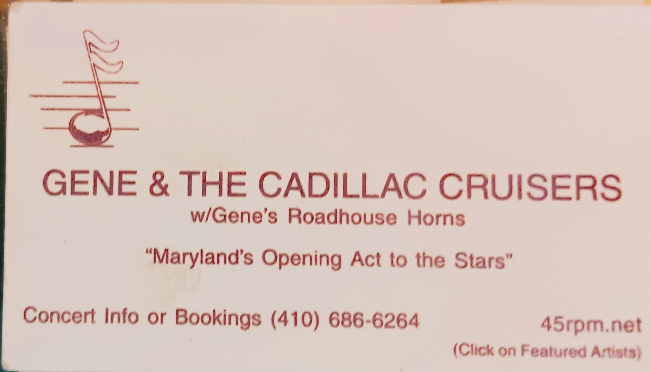 As their personal monicker attests, “Baltimore’s opening act to the stars,” Gene & the Cadillac Cruisers provided backing music or opened for well over 300 different major recording and touring groups from their inception in 1979 through the mid-‘00s. Artists they have performed with include Fabian, Frankie Ford, Joey Dee & the Starlighters, Danny & the Juniors, Bobby Lewis, Little Richard, Crystals, Tommy Roe, Beach Boys…