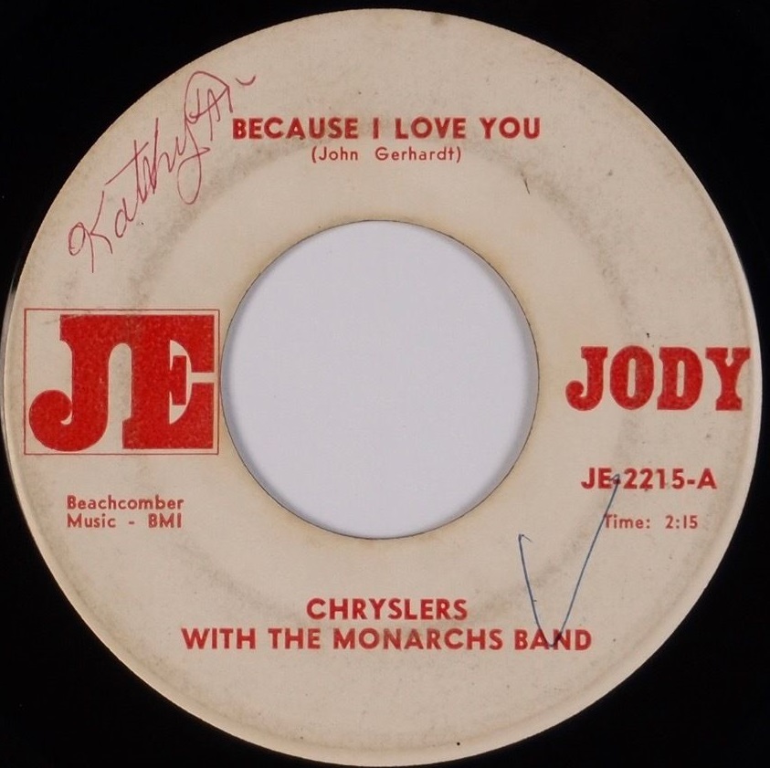 As the Chryslers with the Monarchs Band the group released a smooth soul single in 1967 recorded at Dave Smith’s studio on Biddle Street. “Because I Love You” (written by John Gerhardt) b/w “I’m Not Gonna Lose You” (written by Ronnie Breznicky). The label JE (Jody Enterprises) JODY named after Joe Secola (of TV channel 13), Dave Smith, with Chuck Weber