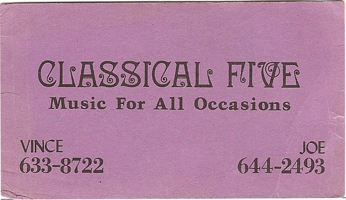The Classical Five formed from members of Penelope. The members of that group were, Rudy D’antoni, Joe and Vince Sanzone, John Drexler, and Ernie Troia, and me — I was the roadie/sound man. Ernie Troia passed away about 11/12 years ago.