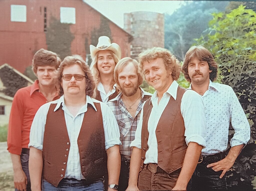 Next to join was Larry Conner (banjo ex-Mountain Phoenix). A career bluegrass player, Conner had never played with “a band where everyone was plugged in,” but “it wound up clicking very well.” Soon afterward Bowen had to leave due to some health problems, and Smitty Roland filled in as needed until the group found a replacement in Fred Tepper (ex-Climbadonkey) to play pedal steel and electric guitar. Tepper brought some of his original compositions to the group but was only around briefly, later going on to join Trigger Happy… He was replaced with keyboard player Ed Pachilis. This lineup of Sheets (guitar), Barnes (guitar), Freizner (bass), Vogt (drums), Conner (banjo), and Pachilis (keys) first performed live on New Years Eve 1976. They went on to play regularly through early 1980 at local venues such as Manor Tavern, Dulaney Inn, Charlie’s West Side, Back of the Rack (O.C.), Peddler’s Pub, No Fish Today, Hopkins Spring Fair, Preakness Week (Inner Harbor), Pikesville Hilton, Mack & Myers, Kelly’s Tavern, Our Place, Oregon Ridge, Famous Ballroom, and as a regular Thursday night attraction at Andre’s in Perry Hall. Dakota shared the stage with many artists including Peter Rowan (of New Riders of the Purple Sage) at the Four Corners Inn, and opened for Pure Prairie League at Johns Hopkins Shriver Hall. They also did shows with the Seldom Scene, Country Gentlemen, J.D. Crowe & the New South, Tom Principato, Danny Gatton, Paradise Pickers…