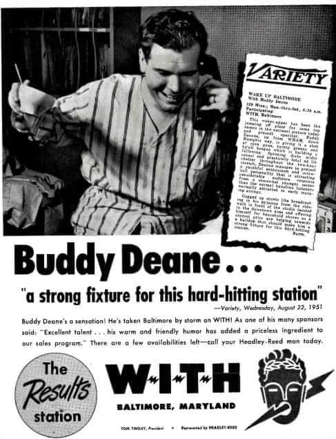 The Deane of Baltimore radio (and TV), Buddy was the Dick Clark of Baltimore television in the late ‘50s and ‘60s. Originally from Little Rock, Arkansas, Winston J. ‘Buddy’ Deane worked at hometown stations KGHI and KXLR (1945-49) and Memphis station WHHM (1949-52) before arriving at WITH in 1952. He was the morning host of the popular “Wake Up Baltimore” program and eventually became one of the first DJ’s in town to play rock and roll music.