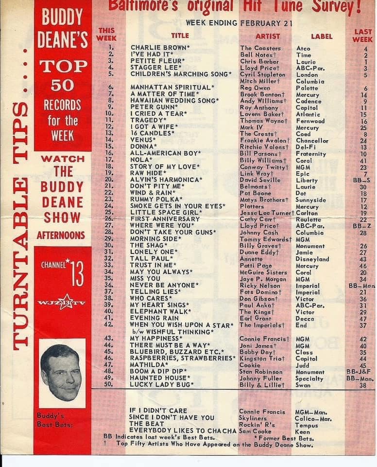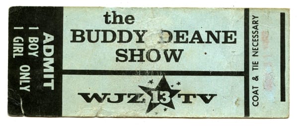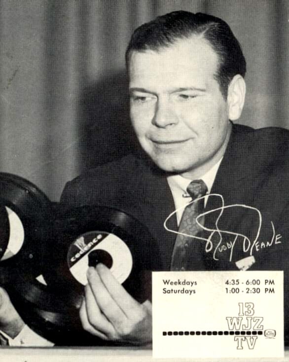 In 1957 WITH Program Director Joel Chaseman began working at WJZ-TV. He suggested that Deane do a music show on TV. Eventually they hit on the format that was to become hugely popular among local teens. The Buddy Deane Show (1957-64) aired Monday through Saturday from 3-5 PM. It was very similar to the American Bandstand teen dance show that originated in Philadelphia and the Milt Grant Show that aired in D.C. In fact, the Philadelphia based Bandstand was not televised in Baltimore due to Deane’s hugely successful show which earned honors as the highest rated local TV show in the nation. Deane’s assistant Arlene Kozak organized the program. Many of the nation’s top artists made appearances to lip-sync their latest hits and participate in interviews.