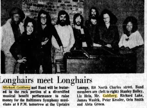 The Michael Goldberg Band participated in a concert to benefit the Baltimore Symphony Orchestra musicians who were on strike. The rock band portion Michael called Longhairs Meet Longhairs featured selections moving from classical to rock music.