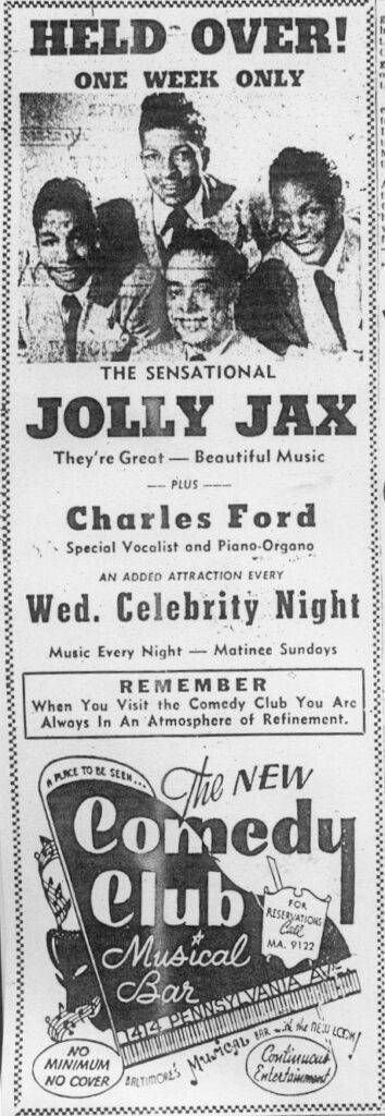 Popular recording group from Turner Station. The Jolly Jax started out performing at the P&M Lounge. They made a name for themselves while frequenting the Comedy Club Musical Bar on Pennsylvania Avenue. They were also a popular attraction at the Club Casino, Flamingo Lounge, and the Surf Club.