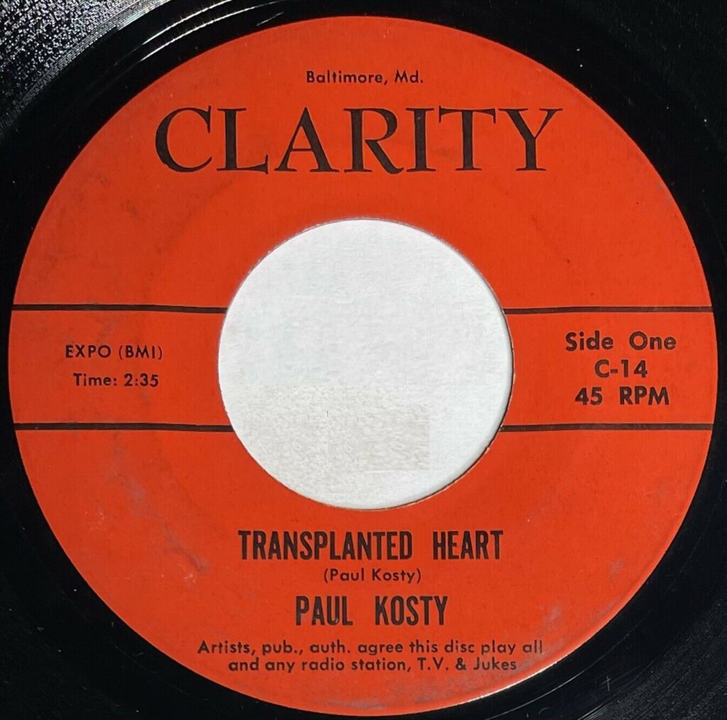 ‘Baltimore’s singing taxi driver,’ Paul Kosty Kostopoulos lived on Eutaw Place. As a recording artist he released several singles. Notes on the Clarity 1/2 label state that it was “the hit that put Clarity Records in business… from his book and the movie “Front Man” and his boxing play “Money.” Orchestration by Will Colbert’s Maryland University Terrapins.” Musicians included Bill Colbert (keyboards), Jack Sutherland (bass), Kenny Krach (accordion), and ‘Dad’ on drums.”