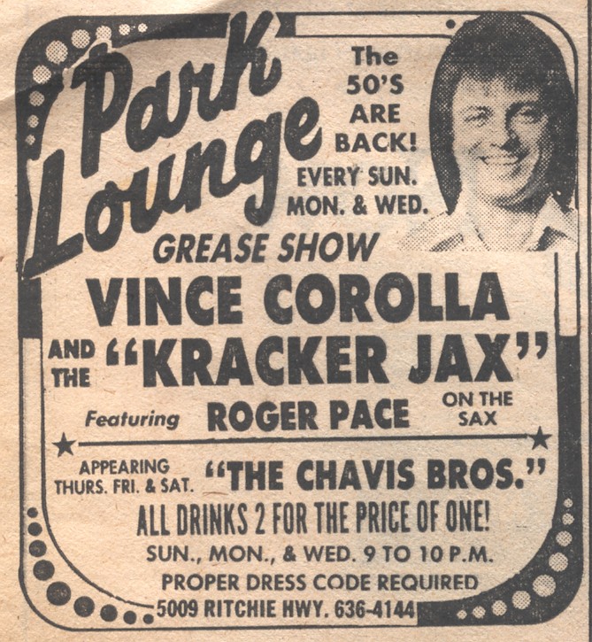 Vince Corolla (Palacorolla) and his fabulous Krackerjax formed by members of the original Blackfoot Smoke and managed by Joe Rubino. They were seen performing throughout the ‘70s-80s at clubs such as the Club Venus, Mimmie Jr.’s, Park Lounge, Cypress Lounge in Severna Park, Oakwood, Reflections. Their floor show featured an oldies revue as Danny & the Del Vinos.