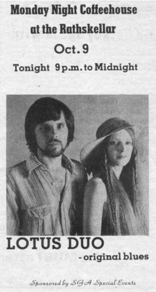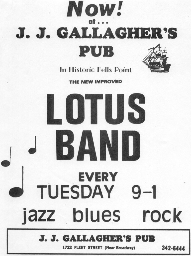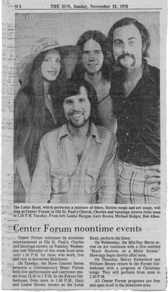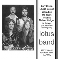 In late 1973 Gary and Louise returned to Baltimore. With Bob Albee (bass) they formed a new group called the Lotus Band that also included Michael Hedges (electric guitar, flute). The group performed at the Peabody Book Store & Beer Stube, Clark Street Garage, Angel’s Grotto, Jo’s Organic Bar, Jade Palace, Toni’s Dream, J.J. Gallaghers, and many of the Fells Point clubs.