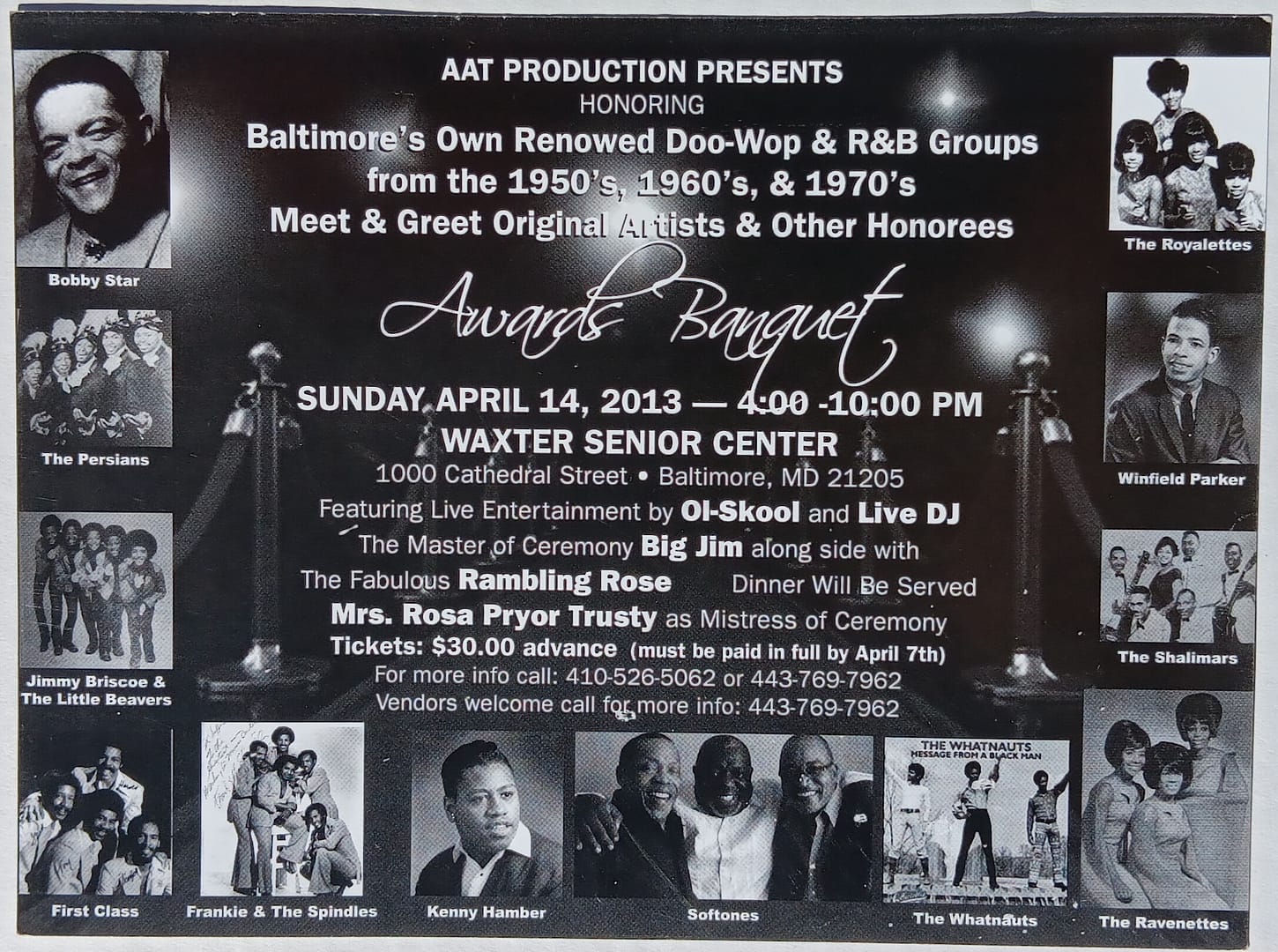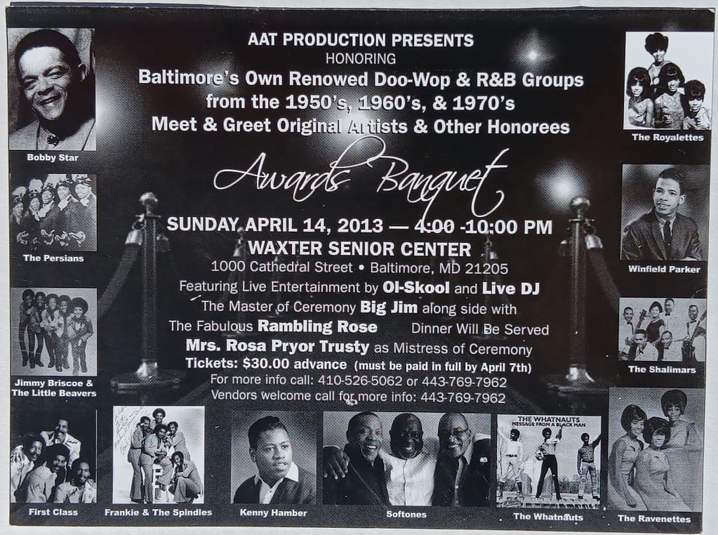 Viola Griffin and AAT Productions first Awards Banquet to honor Baltimore’s own renowned Doo-Wop & R&B groups from the 1950’s, 1960’s & 1970’s took place on Sunday April 14, 2013 at the Waxter Senior Center 1000 Cathedral St., Baltimore, MD 21205.