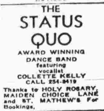 Late 1968 Chenoweth left and joined the band Flying Circus, the Status Quo recruited lead vocalist Collette Kelly. The group played gigs at the Holy Rosary, Maiden Choice, Brooklyn Park, and St. Matthew’s Teen Centers, St. Claire’s CYO, Holabird Jr. High School….