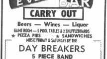 House band on weekends at Capt. Harvey’s on Cross Street, and at Evergreen’s Bar on Route 1 in Elkridge…