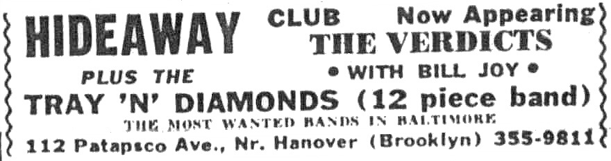 The Verdicts could be seen at The White Gables (their first club job), the Hideaway, Bobby’s Club DeVille in Brooklyn, finally becoming one of the house bands at the famed Rhapsody Club. The Verdicts, a guitar combo, were somewhat different from the other bands that frequented the Rhapsody like the larger soul bands the Upsetters, and the Van Dykes. The band played the Top-40 hits of the day along with some blue-eyed soul and the British sounds. For over six years the band played at the Rhapsody and had the opportunity of playing alongside – or backing up – many of the big-name headliners that appeared there including Mitch Ryder, Otis Redding, Dovells, Orlons, Ronnie Dove, and many others.