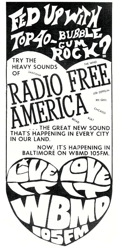 105.7 FM. In the ‘70s became an alternative music station - eventually evolving to become WKTK - much later to be known as WQSR. WBMD-FM advertisement - 1971