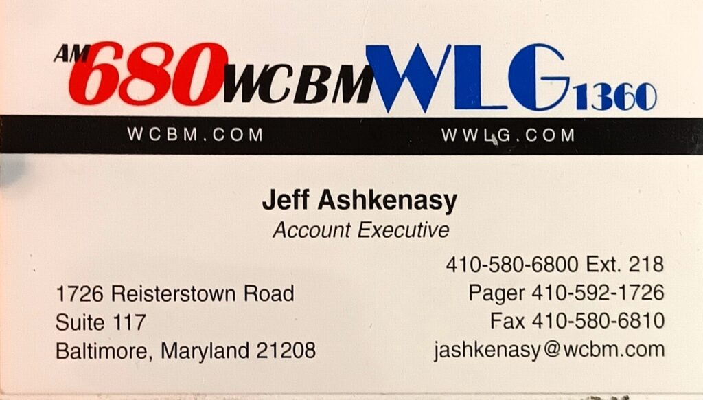 680-AM WCBM switched to a news station in 1982. It continued in the ‘00s as a News-Talk-Business-Information and Sports station. The morning team featured former 1960s WCAO jock Frank Luber. Account Executive Jeff Ashkenasy (Broadcasting Institute of Maryland alumnus).