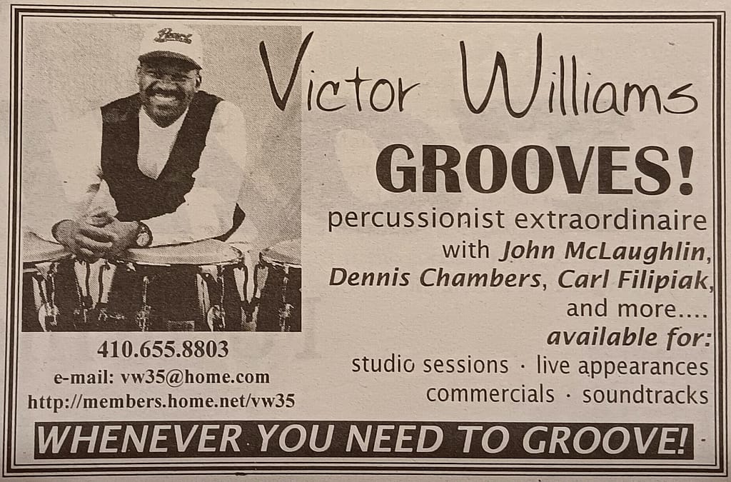Percussionist endorsed by Pearl Percussion, Victor Williams became a highly regarded percussionist of many musical styles from pop to jazz to groove to gospel. Fellow musician Terry Battle described his style as “AmAfroCube” by his mastery of American, African, and Cuban rhythms.
