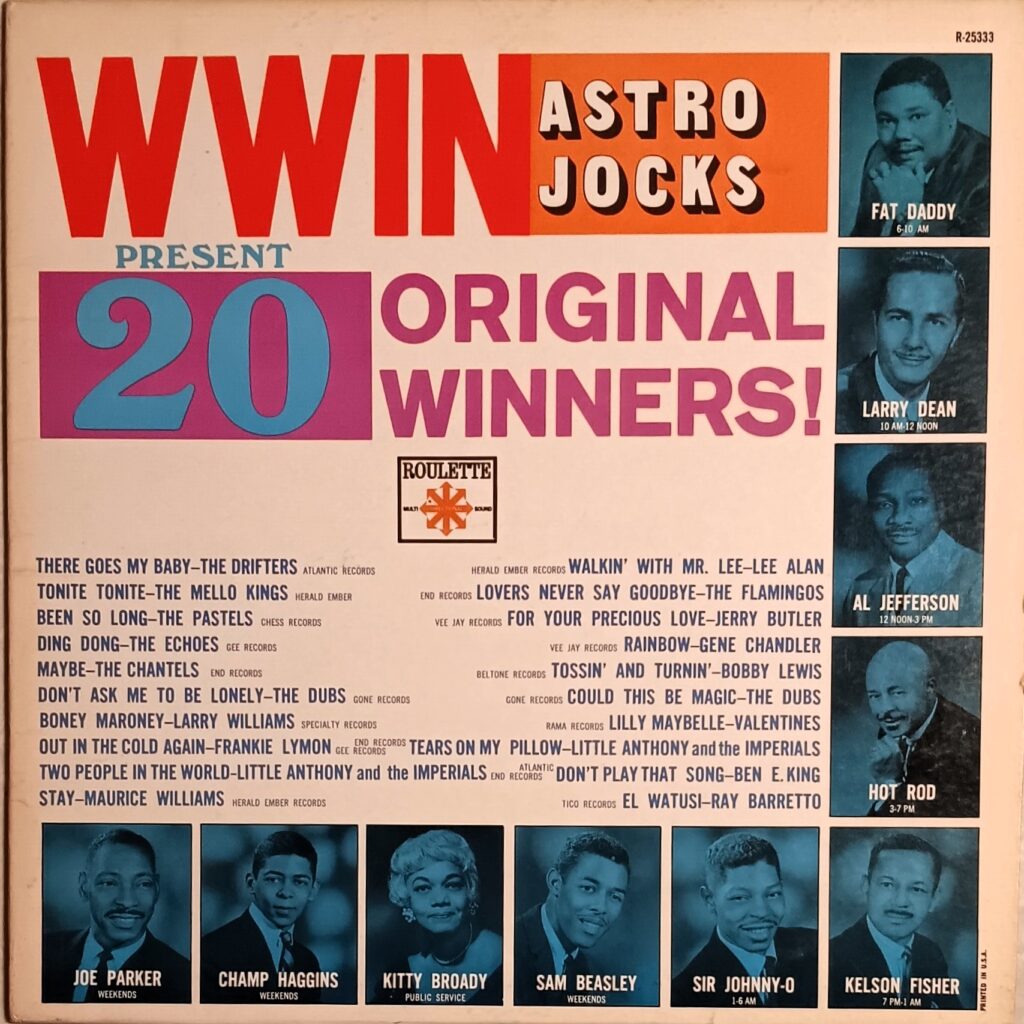 WWIN 1400-AM was where to go for round-the-clock R&B music. In the early 1960s WWIN was the only 24-hour R&B station in Baltimore. Home of the “Astro Jocks” where you could hear the hottest new sounds as well as the classic old hits. The station briefly switched to a Top-40 station 1962-63 before returning to R&B music.