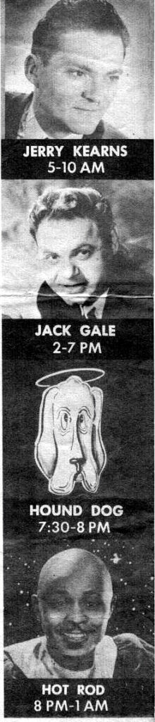 The early 1960s lineups featured Hound Dog, Hot Rod, Jerry Kearns, Jack Gale, Ed Graham, Johnny Z, Tom Tyler, Danny Thompson, Roz Ford, Ray Davis, Dave Carrico, Dennis Hill, Donn Keller, John Jeppi, Billy Foxx, Jim Sands, and others. In 1963 the station switched to playing R&B hits. With it came some changes in personnel. Larry Dean joined (formerly of WITH), along with Kitty Broady, Jocko Henderson, and Mr. V. The line-up also included Colt football player Lenny Moore. Tom Tyler later moved to Philadelphia and had a successful career at WFIL.