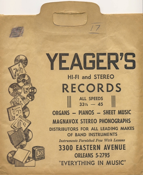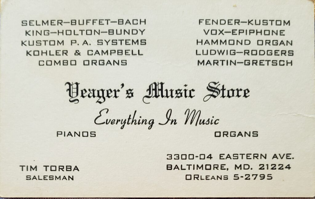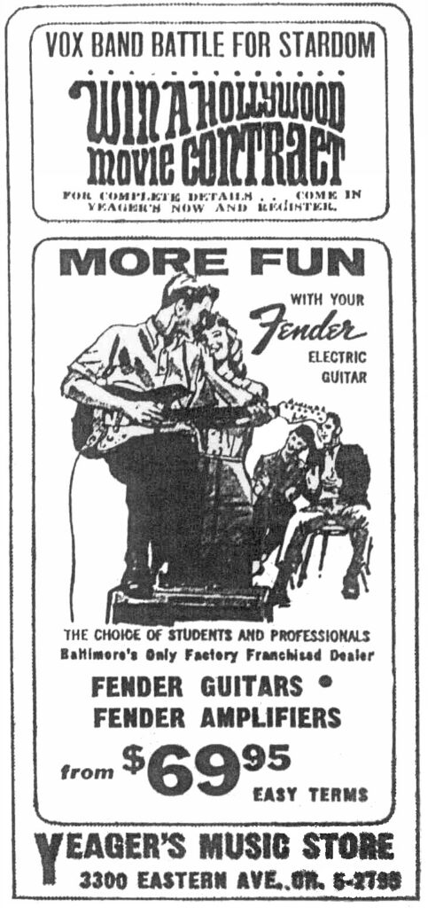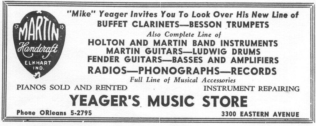 Mike Yeager's Music Store was located at 3300 Eastern Avenue. One of the major musical instrument stores in the East Baltimore area. Exclusive Fender dealer. 1949 February 1967