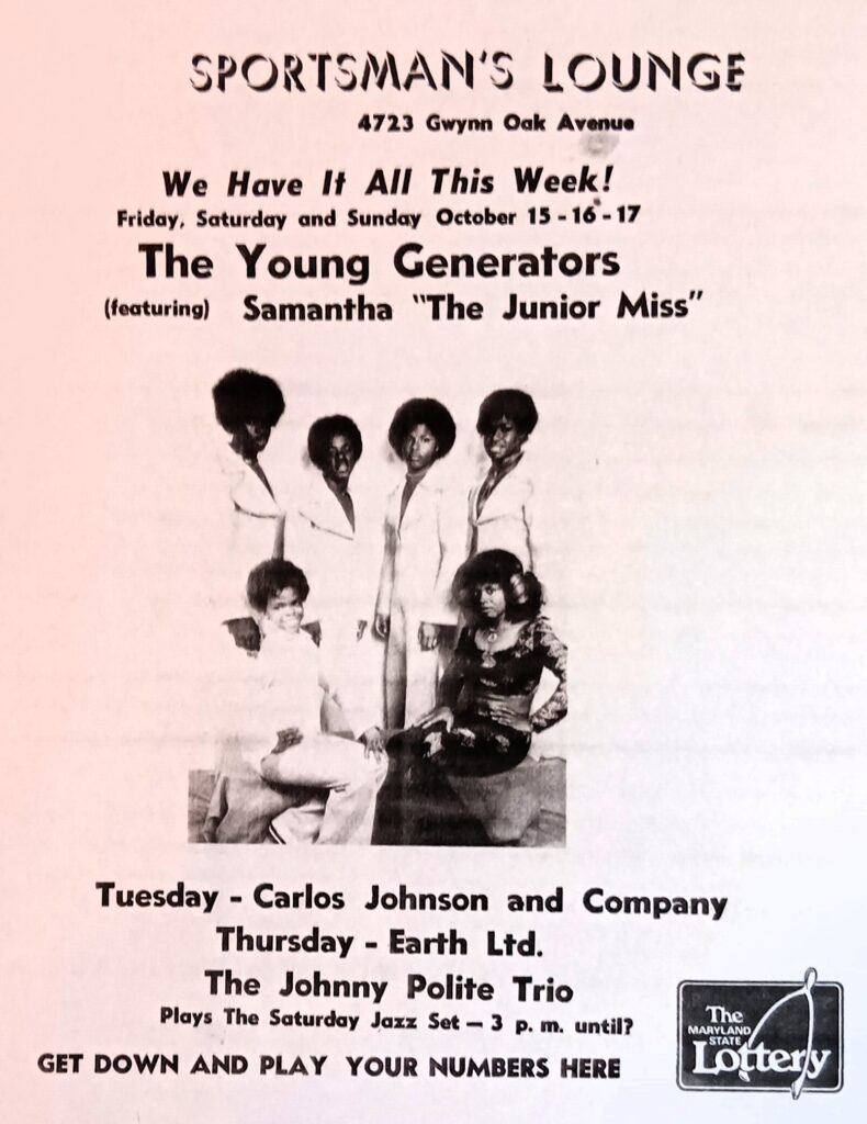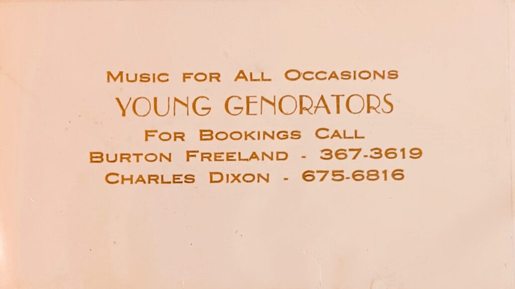 Young Generators were the house band at My Brother’s Place on North Gay Street. They played at various other clubs in the Baltimore area such as the Red Barn, Outer Limits, Bear’s Den, Sportsmen’s Lounge, Famous Ballroom, Al Brown’s Place, Elite Club, Cherry Hill Union Hall, 3 B’s, Twenty Grand, G&G Lounge, Carmel Hall, Maritime Union Hall, 1-2-3 Club in Aberdeen, Walter Reed Hospital in D.C., etc.